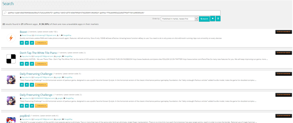 It seems that some of the apps related with the developers were uploaded to Google Play back in late December or January. Searching with Tacyt for some specific binary files inside the apk, it brought us to some apps on Google Play which have been removed last January from the market.