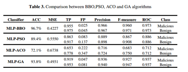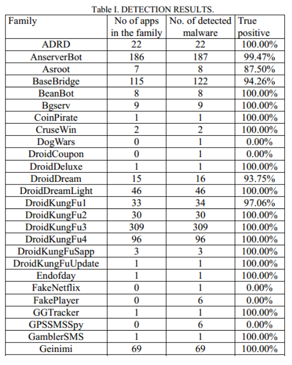 Los resultados en artículo y experimento resultan bastante pobres. No muestra la tasa de falsos positivos que se intuye muy alta en la tabla adjunta. Además habla de la detección dentro de una misma familia y no en general, algo que resulta mucho más sencillo y con lo que la tasa de acierto se infla artificialmente.