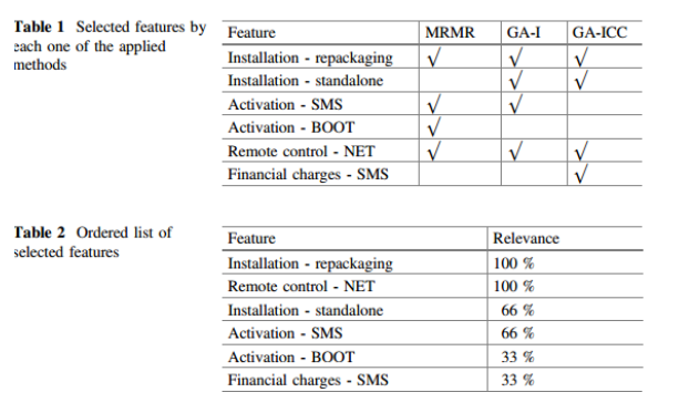 En este artículo se vuelven a usar algoritmos genéticos para intentar descubrir las funcionalidades más relevantes que caracterizan al malware. Se toman 49 muestras de malware de Android (una de cada familia del conjunto usado) cada una con 26 funcionalidades. Por un lado se utiliza MRMR (Minimun Redundancy Maximum Relevance), un algoritmo de filtrado que busca que las funcionalidades sean lo más relevantes posibles y mínimamente redundantes (diferentes entre sí). Por otro lado, además, se usan algoritmos genéticos básicos con dos funciones de fitness diferentes: Mutual Information (I) y Information Correlation Coefficient (ICC), dos formas de medida de teoría de la información.