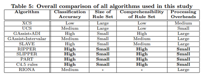No solo se evalúa su "accuracy", sino también el número de reglas generadas, la comprensibilidad de las reglas (aunque resulte subjetivo, se pretende evaluar qué reglas resultarían útiles para un humano) y sobre todo, el tiempo necesario para los cálculos. La conclusión es muy interesante. Si bien todos los algoritmos se mueven en entornos aceptables por encima del 99% de precisión, es clara la diferencia: los no evolutivos son más precisos. De entre los evolutivos, GAssist-ADI y SLAVE tienen la mejor puntuación (que no supera a los no evolutivos), pero su tiempo de proceso los hace inutilizables para ofrecer una respuesta en tiempo real. UCS es el único que funciona con mejores tiempos, pero a costa de una precisión menor. En este estudio destaca el uso de 11.786 ejecutables para las pruebas de los que se extraen estáticamente 189 funcionalidades propias de los ejecutables (desde la versión del compilador, pasando por su timestamp a su tamaño). La conclusión final es que los algoritmos de aprendizaje evolutivos no mejoran la detección ni son usables en tiempo real.