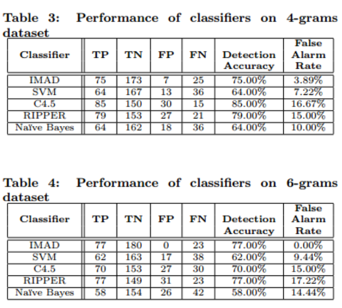 En los experimentos, se utilizan 100 muestras de malware y 180 de "goodware". A todas luces, una muestra insuficiente que invalidaría las conclusiones de cualquier análisis. La clasificación se compara con algoritmos de clasificación como Support Vector Machine, C4.5, Bayesianos y RIPPER. IMAD, apoyándose en algoritmos genéticos, obtiene unos resultados de éxito interesantes (no llegan al 90% de "accuracy"), aunque llama la atención que la optimización introducida con los algoritmos genéticos permite reducir la tasa de falsos positivos al 0% en algunos casos frente al resto. Aunque reducir los falsos positivos resulta especialmente atractivo, como se ha mencionado, con 100 muestras de malware los resultados de este informe en concreto no son relevantes.