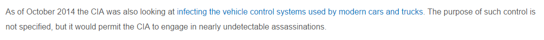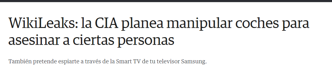 Pues eso, titulares. Al parecer disponían de conocimiento único sobre cómo vulnerar todas estas tecnologías. Pero todavía está por ver si en connivencia con el fabricante, disponían de puertas traseras específicas para espiar. De lo contrario, lo que han hecho es "su trabajo": buscar vulnerabilidades… y no publicarlas para aprovecharse de ellas. Esto es cuestionable y debatible. Los "coches asesinos"… por ahora, parece que eso más bien lo ha aportado Wikipedia de su propia cosecha. En los documentos se observa que la CIA quería desde 2014 encontrar formas de infectar los sistemas de control de vehículos modernos. Wikileaks es la que habla de que potencialmente podría ser usado para realizar asesinatos selectivos y no detectables (no habría forense sobre un coche destrozado).