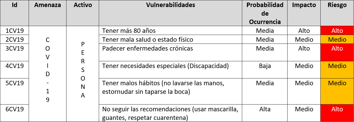 - Amenaza: un evento con el potencial de afectar negativamente a la confidencialidad, integridad o disponibilidad de los activos de información. En este caso se trata de un evento con el potencial de afectar nuestra salud (integridad), el COVID-19.