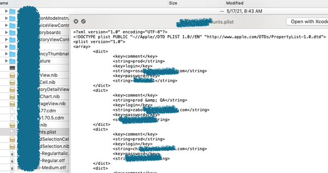 Otro aspecto que llama la atención, es que encontramos estructuras fácilmente legibles entre archivos .plist, lo que nos denota una mala práctica en cuanto almacenamiento inseguro de estos datos o inadecuada revisión previo a subir las aplicaciones a las tiendas.