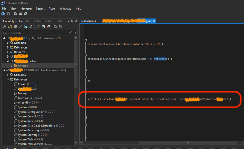 reversing se puede llegar a de-compilar los archivos ejecutables (binarios), en este caso un aplicativo .NET donde se obtiene el código legible y a través de estas técnicas obtener datos “hardcodeados” (credenciales de conexión a DBMS SQL Server).