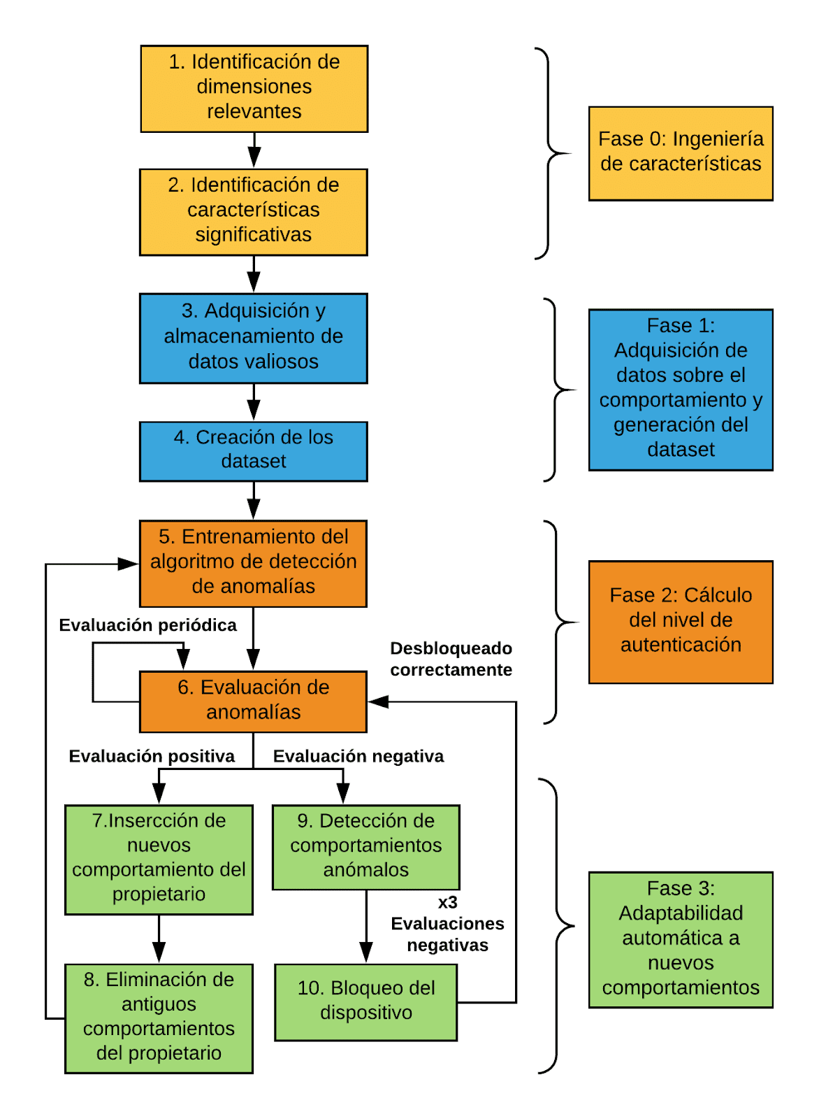 - Fase 3. Adaptabilidad del sistema a nuevos cambios del comportamiento del usuario mediante la inserción y eliminación de vectores en el dataset, manteniéndolo actualizado y previniendo el sobre-entrenamiento del sistema.