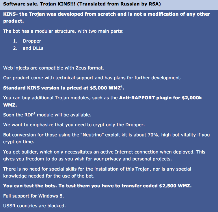 El malware basado en Zeus está en continuo movimiento y mejora, en un intento de hacer caja con la venta del producto. Como ejemplo, una nueva variante de malware bancario "as a service" aparecido en 2013 es “KINS” (Kasper internet non security) desarrollado a partir de Zeus y añadiendo mejoras de SpyEye. Se puede adquirir en el mercado negro y se espera que cubra el hueco dejado por sus antecesores y aproveche un trozo del "mercado".