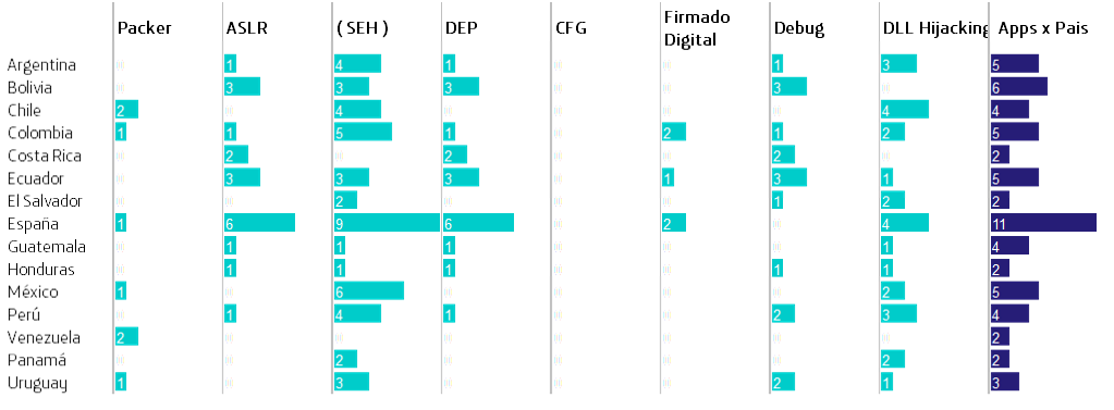 - En cuanto a los niveles de seguridad identificados en los binarios de nuestro estudio podemos indicar que tecnologías más recientes como CFG no están activadas en ninguno de los programas. Otro tipo de controles más conocidas como ASLR y DEP solo están presenten en el 30% de las evaluadas. Esto nos alerta que deberán integrar en el ciclo de desarrollo la activación de todas las características anti-exploiting posibles para elevar el nivel de seguridad de los binarios.