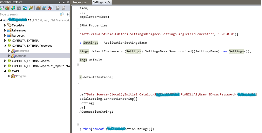 En alguna decompilación de los binarios (sencilla al utilizar .NET) se pueden observar contraseñas de acceso a la base de datos.