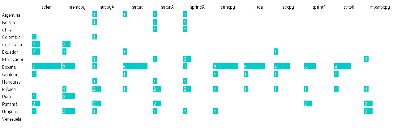 - En total se encontraron 148 funciones obsoletas o vulnerables que han sido usadas en el desarrollo de las 62 aplicaciones. Entre las que más ocurrencias encontramos destacan memcpy(), strlen(), strcpy(), strcat(), sprintf(), lo que puede determinar un grado relevante de inseguridad dentro del host donde se esté ejecutando estos programas.