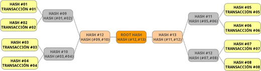 En la práctica, el árbol de Merkle lo que busca es poder relacionar una serie de datos separados en un único hash (raíz) para reducir el tiempo y recursos empleados en verificar la integridad de una cantidad de información. Esta estructura relaciona todas las transacciones y las agrupa entre pares para obtener un Root Hash o "dirección maestra", la cuál está basada en todos los hashes del árbol. Verificar todas las transacciones de una red sería algo extremadamente lento e ineficiente, por eso se implementó este sistema: si un hash es cambiado, cambiarían todos los demás hasta llegar a la raíz (Root hash). En un Árbol de Merkle los hashes se agrupan en pares en una relación 2n, donde "n", es la cantidad de pares, y no existe un número máximo determinado, pueden ser 2, 4, 8, 16… los límites los establece el tamaño del bloque. De esta forma, validar 10.000 transacciones en la red cuestan lo mismo que validar una única transacción.