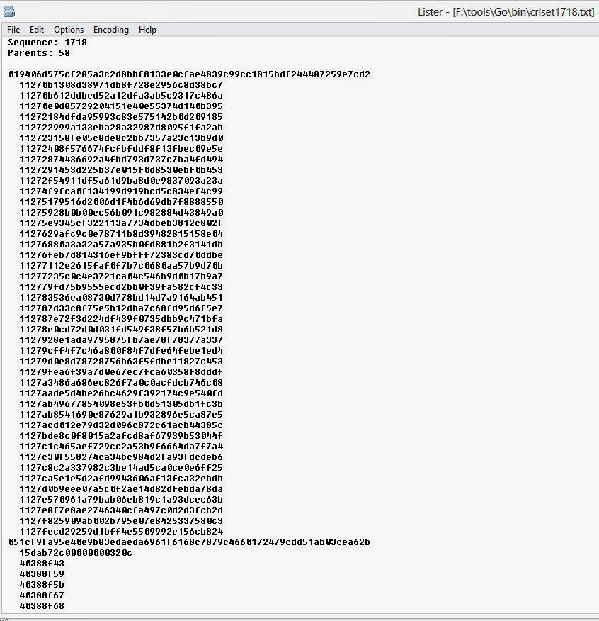 Al descargar el CRLSet más reciente, se observa un JSON con varios SPKI. Luego una lista de certificados padre, seguido de números de serie de certificados. Como un número de serie se puede repetir entre certificados diferentes, se organizan de esta manera puesto que un padre no debería emitir dos números de serie iguales. En algún punto de esta lista, se encuentran ya los certificados falsificados. El uso de CRLSets no es la mejor manera de proteger de forma global a los usuarios, pero sí es un método rápido con el que Google se permite reaccionar al margen de la industria de las CA.