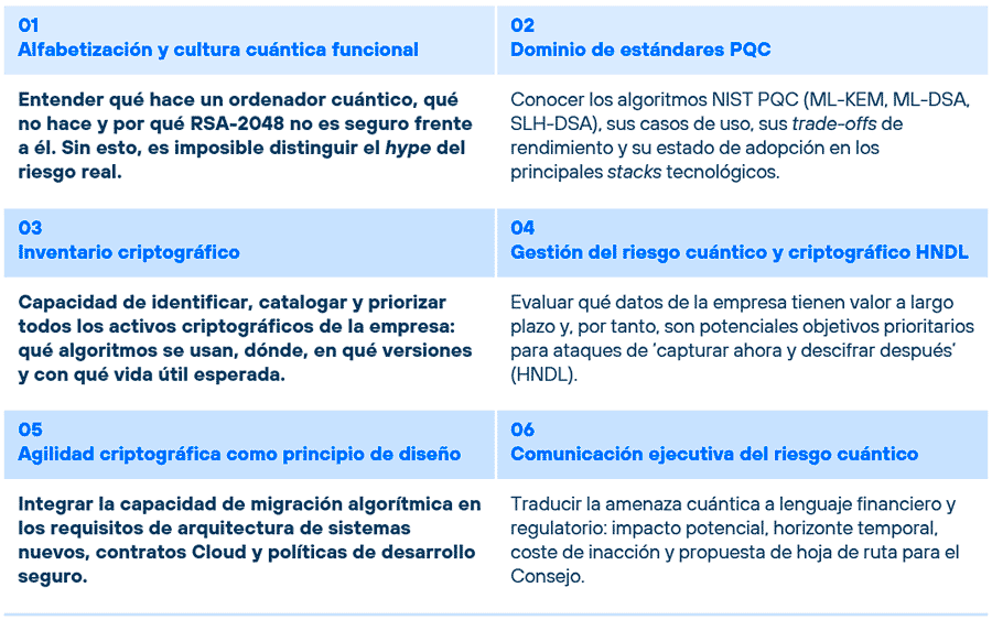 Probablemente la competencia más infravalorada es también la más crítica: la capacidad de hacer que el riesgo cuántico sea comprensible y priorizable para un consejo de administración que tiene otras diecisiete prioridades encima de la mesa.