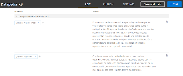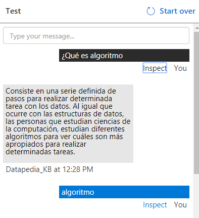 Se han cargado todos los términos y sus definiciones de forma automática. Desde esta pantalla podemos editar las parejas de pregunta/respuesta si es necesario. También, con el botón “+ Add QnA pair” podemos crear de forma manual nuevas entradas. Como todo está bien, guardamos y entrenamos “Save and train”. Una vez entrenada la KB, la ponemos a prueba con el botón “Test”- Si preguntamos, por ejemplo, qué es un algoritmo obtenemos esta respuesta: