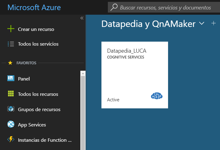 Una vez creado el servicio en Azure, volvemos a QnAmaker para el segundo paso que había que dar: conectarlo a la base de datos o KB. En este paso tenemos que indicar el directorio activo de Azure y la suscripción sobre los que vamos a trabajar (dependerá como antes, de los que tengamos configurados), y le indicamos el nombre del servicio (Datapedia_LUCA) y el nombre de la KB (Datapedia_KB)