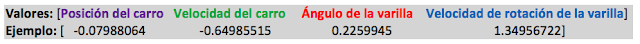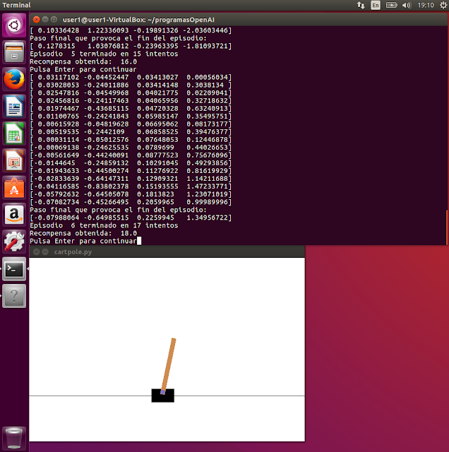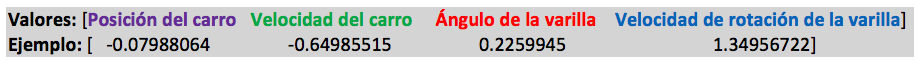 if done: print ("Paso final que provoca el fin del episodio:") print(observation) print("Episodio ",i_episode,"terminado en {} intentos".format(t+1)) recompensa=recompensa+reward print ("Recompensa obtenida: ",recompensa) break