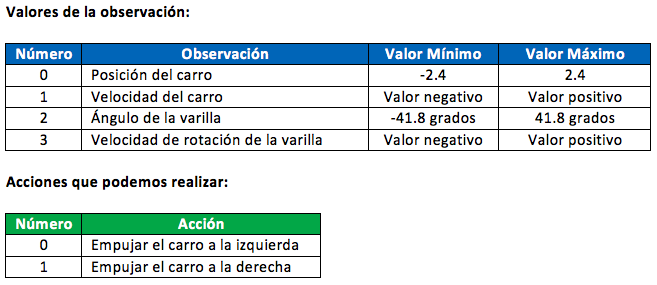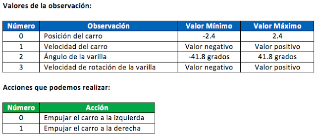 - observation (tipo “objeto”): es un elemento representado en el entorno que estamos analizando. Por ejemplo, puede ser el tablero de un juego de mesa o la velocidad y ángulo de la bola del juego BreakOut.