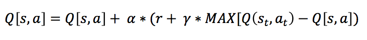 - MAX[Q(st,at) calcula el valor máximo de Q dentro de todas las posibles acciones que aparecen en el siguiente estado, se resta con los valores del estado actual y se calcula el máximo.