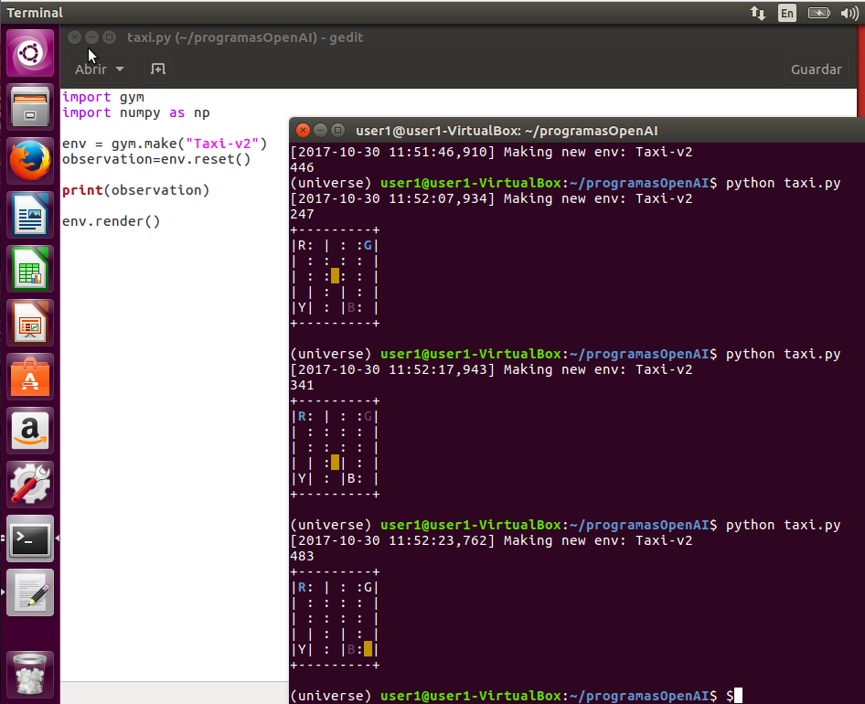 import gym import numpy as np env = gym.make("Taxi-v2") observation=env.reset() # Visualizamos el valor devuelto al resetear el entorno print(observation) #Mostrar el estado actual del entorno env.render() #Movimientos del taxi action=1 #mover arriba (north) el taxi observation, reward, done, info = env.step(action) print (env.step(action)) env.render() action=2 #mover derecho (east) el taxi observation, reward, done, info = env.step(action) print (env.step(action)) env.render()