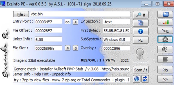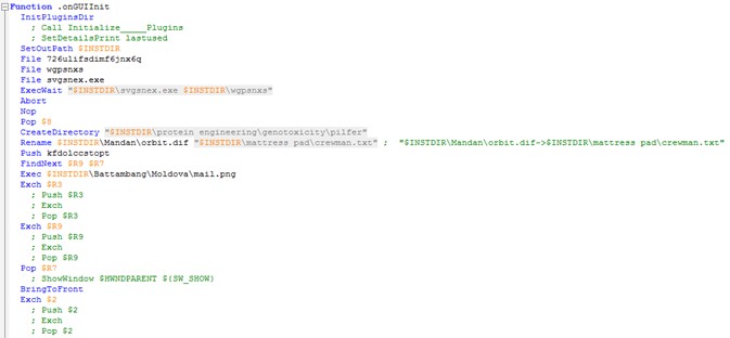 Obtenemos un script de ejecución habitual en Nullsoft, el cual indica cuáles son las carpetas donde va a guardar y a ejecutar los ficheros auxiliares que utilizará más tarde: