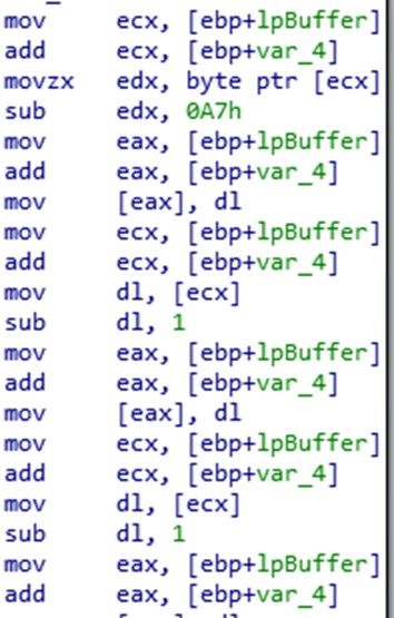 Con estos espacios de memoria vemos que posteriormente tendrá en buffer datos que introducirá durante la ejecución en la memoria de un proceso o un hilo. Se tratará de un bucle, por lo que irá rescatando información de su propia memoria y de ficheros auxiliares: