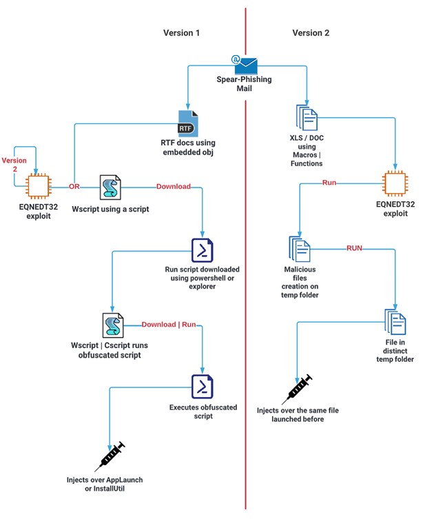 Dicho malware suele ser introducido mediante correos con documentos adjuntos y, dependiendo de la versión, se han visto distintas ejecuciones; desde explotaciones de vulnerabilidades, hasta distintos scripts que se entrelazan entre sí.
