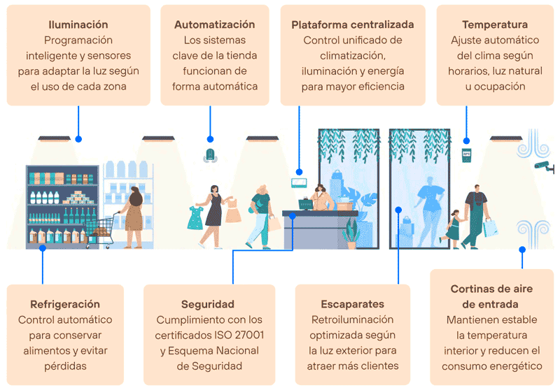 - La optimización de los sistemas de mayor consumo, como la climatización, la iluminación en tienda y escaparates, las máquinas de refrigeración y las cortinas de aire en las entradas, lo que contribuye a generar ahorros energéticos significativos.