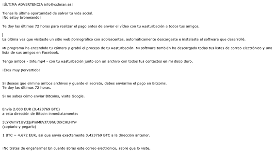 Esta campaña, no tan nueva, está cobrando fuerza en las últimas semanas. Donde se nos avisa que en caso de no ceder a una extorsión un “Hacker anónimo” va a filtrar vídeos que ha grabado con nuestra propia webcam haciendo actos impuros mientras visitábamos webs de adolescentes. El mensaje tiene un plus de credibilidad ya presenta datos reales de la víctima y, si ha reutilizado la contraseña, cómo saber si la ha obtenido hackeando esa web para adultos se convierte en un dilema…