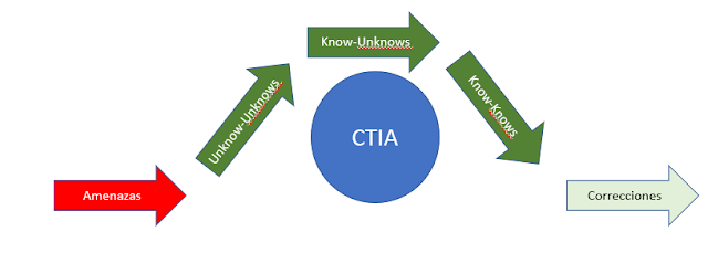El proceso de CTI comienza enla etapa “Unknown Unknowns”, en la que no se tiene idea acerca de las amenazas y se intenta localizarlas. Después de obtener información acerca de las amenazas, pasamos a la etapa 2 llamada “Known Unknowns”. En esta etapa, se analiza la información y se entiende la naturaleza de las amenazas, y con estos datos se llega a la etapa 3 donde se mitigan las amenazas, a esta etapa se la conoce como “Known Knowns”.Como resumen, nos referimos a CTI como “el proceso de recoger información acerca de los presuntos ataques para entender el motivo que hay detrás de dichos ataques”, luego se analiza esta información recogida para intentar securizar por adelantado las infraestructuras IT de la empresa. De forma gráfica: