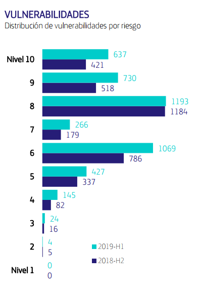 Hemos analizado 4.495 vulnerabilidades en este primer semestre de 2019. Como en el anterior, el 62% pertenecen a una severidad clasificada como 7 o superior. Oracle, Adobe y Microsoft se mantienen como los fabricantes con mayor número de CVEs asignados.