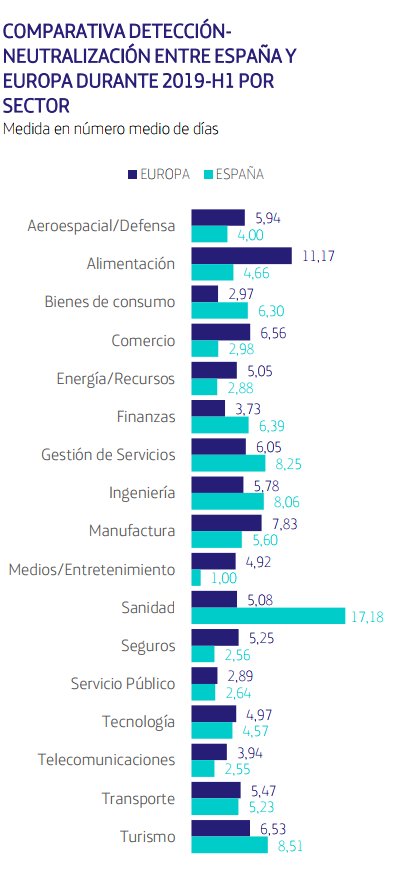 Una compañía europea necesita una media de casi 5 días para solucionar una amenaza de malware, dos más comparado con el semestre anterior. El sector más rápido es el legal (solo necesitan dos días), mientras que el más lento es de nuevo el sector de producción alimenticio (y ahora necesitan de 11 días). En España, el sector salud necesita hasta 17 días para neutralizar una amenaza de malware.