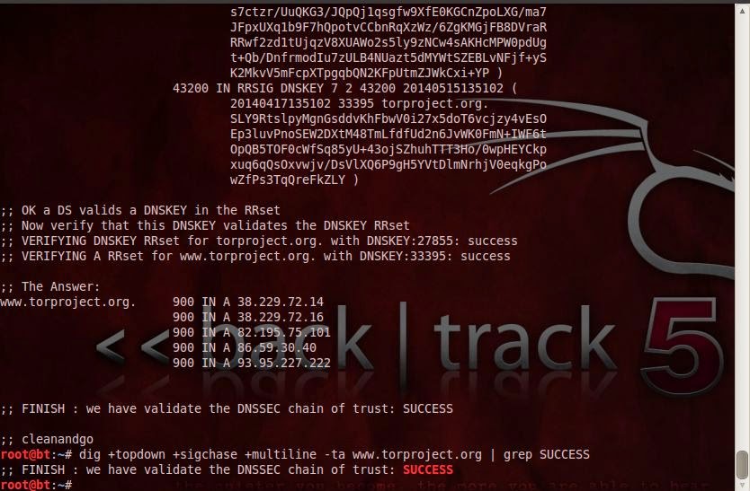 - Se puede comprobar además que los datos del registro DNS están firmados de forma correcta. El comando: dig +nocomments +nostats +nocmd +noquestion -t dnskey . > trusted-key.key almacenará la clave de la raíz. Luego, el comando dig +topdown +sigchase +multiline -ta www.torproject.org devolverá si la operación de comprobación de todas las cadenas ha tenido éxito o no.