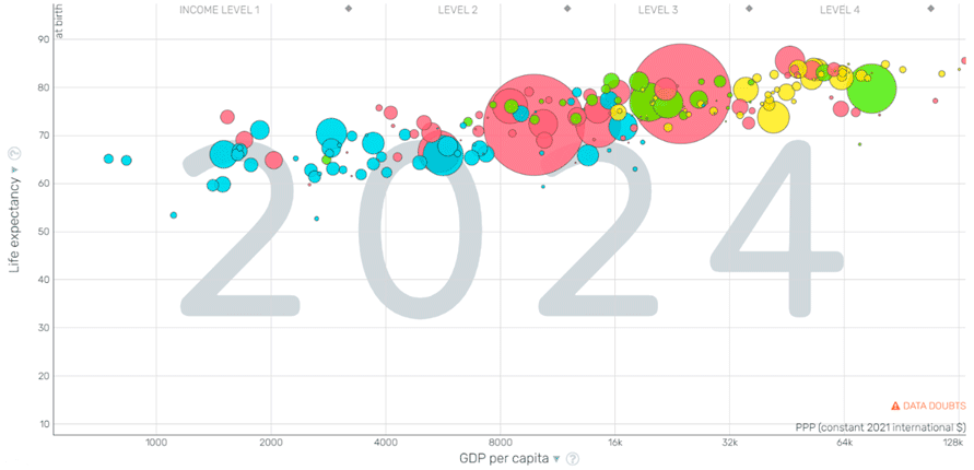 El tamaño, el color y la posición de cada burbuja cambiaban para reflejar al mismo tiempo la evolución de la esperanza de vida, el PIB per cápita y la población. Y mientras las burbujas se movían, crecían y convergían, la audiencia podía ver cómo los datos desmontaban el mito de la división rígida entre “ricos” y “pobres”.