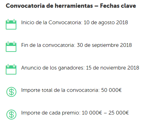 50.000€ en ayudas y el número de premios dependerá de los importes solicitados por los proyectos finalistas. Cada participante podrá decidir el importe que necesita para finalizar su proyecto, entre 10.000€ y 25.000€ como máximo. Además de la ayuda económica, los proyectos seleccionados recibirán apoyo técnico por parte de un mentor de