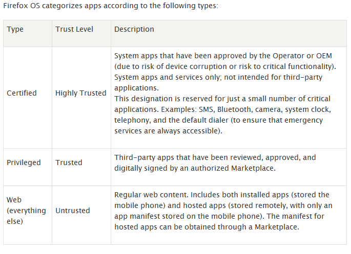 Algo que diferencia en cierta forma a Firefox OS es cómo clasifica los permisos de las apps. Las habrá de tres tipos: