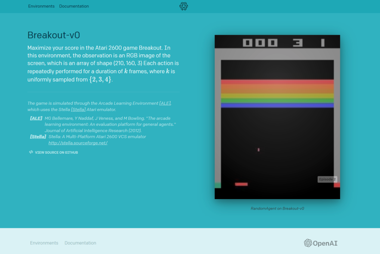 - Un espacio de observación (env.observation_space), que puede representarse por un estado del juego, es una matriz height x width x deep = 210 x 160 x 3, representa los valores de píxel de una imagen en el juego. La tercera dimensión se reserva a los valores de rgb definidos en cada píxel para una paleta de colores de 128 bytes.