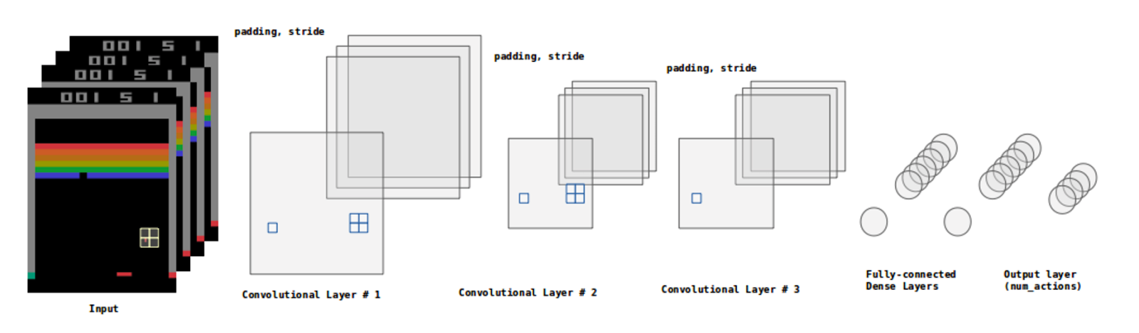 - El espacio de acciones (env.action_space.n) se define para este juego como un grupo de 4 enteros [0, 1, 2, 3]. La correspondencia de estos enteros con las acciones permitidas se puede obtener por medio de env.unwrapped.get_action_meanings(), que devuelve ['NOOP', 'FIRE', 'RIGHT', 'LEFT'].