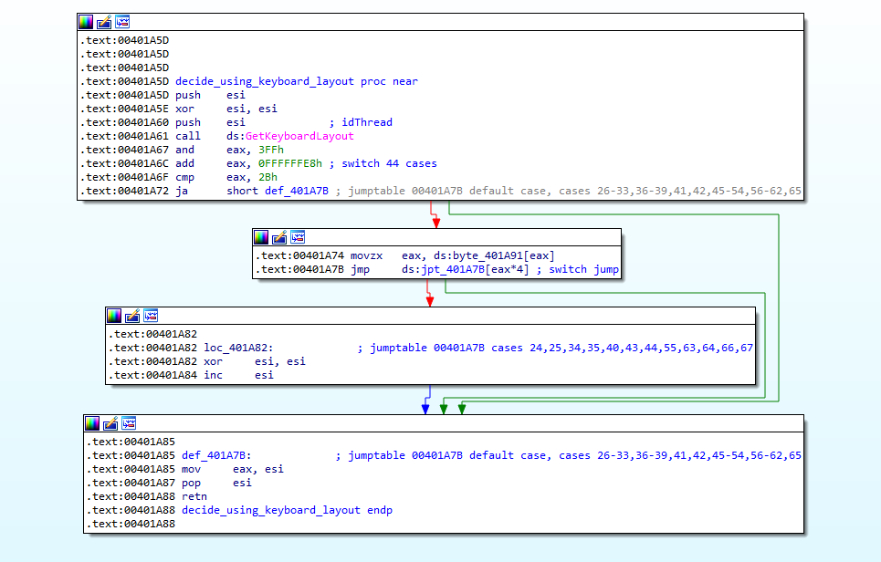 Encontramos además un fragmento de código en el que la muestra comprueba el idioma en el que está configurado el teclado de la víctima y, según este, proseguirán o no con la infección. Esto es habitual, no obstante, el caso encontrado aquí es un poco diferente. En vez de lo anterior, encontramos un rango de hasta 43 idiomas que, mediante códigos numéricos (LANGUAGE IDENTIFIER) consecutivos, se librarían de la infección.