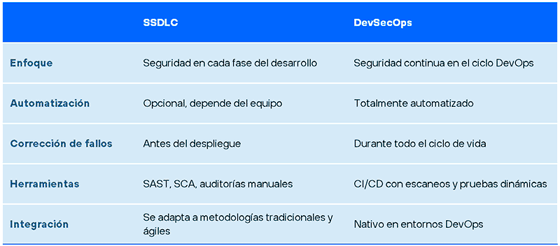 Aunque SSDLC y DevSecOps comparten el mismo objetivo, su enfoque es diferente: