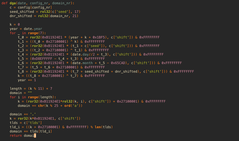 Aquí tenemos una vista parcial de una función encargada de generar dominios. Como casi siempre, en todos los algoritmos de este tipo, tenemos el parámetro fijo “date” (la fecha actual), que servirá como punto fijo o eje sobre el que pivotará el algoritmo para que tanto el malware como los creadores de este puedan generar los mismos dominios. Dado que es un parámetro dinámico pero conocido por ambos, el resultado de la ejecución será idéntico para ambas partes.