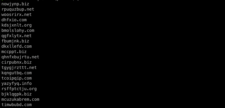En la imagen abajo tenemos una lista parcial de dominios DGA generados. Como podemos ver, parecen sacados de una trituradora de documentos. Fijémonos en que no poseen ningún tipo de similitud con un dominio “normal”; y si la tienen, esta apariencia es debida más al azar que al propósito.