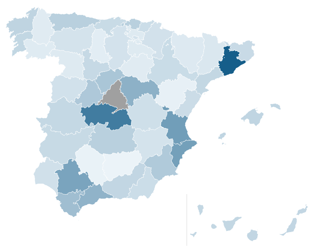 - En el resto podemos destacar provincias alrededor de Madrid y unas cuantas provincias costeras alrededor de toda España.