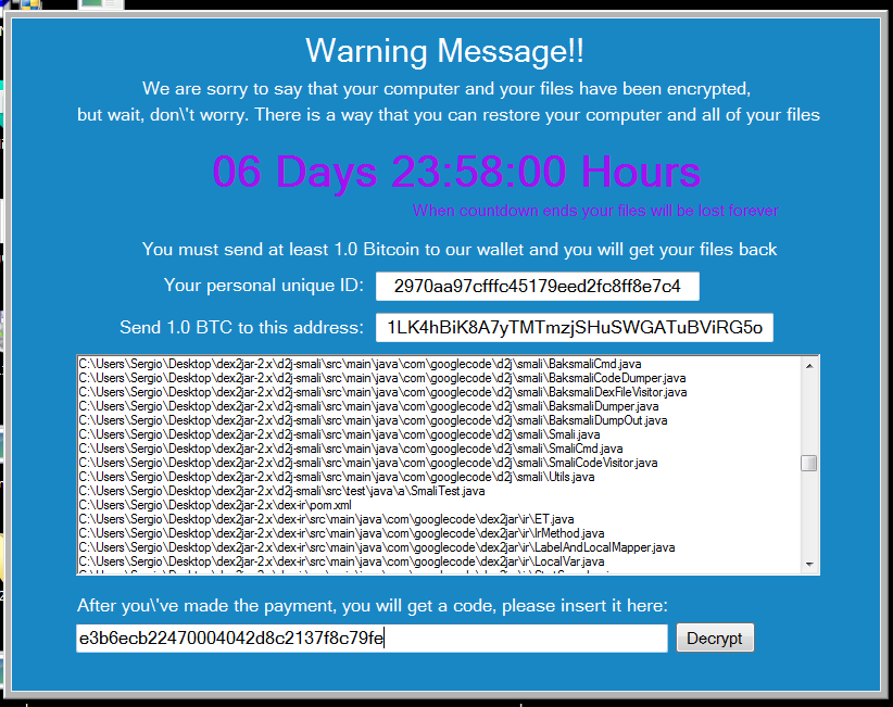 The result of the decoding is the password that can be entered in the corresponding dialog to decrypt the data without having to pay at all.