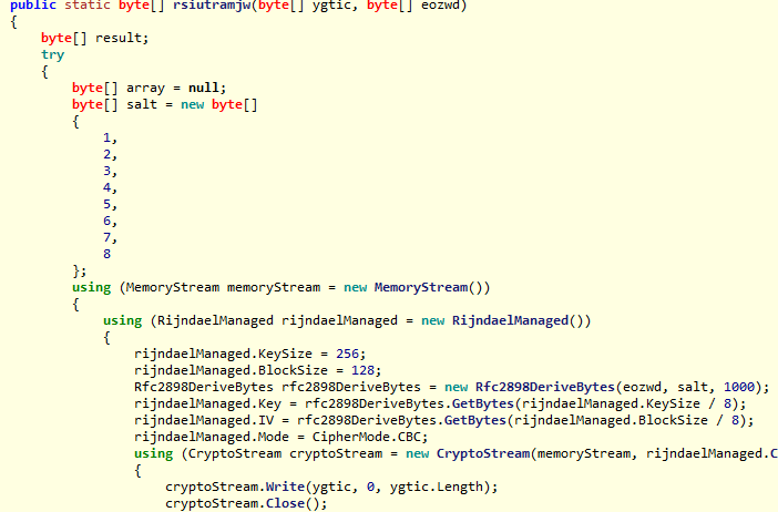 The rest of the code is sometimes messy, although it seems they are working day by day to improve it. For example, the salt in the cryptographic function is not random. This, which in any other circumstance would allow a precomputed dictionary attack, really does not have much effect here (the password is not in a dictionary, it is a hash), but it gives us an idea of the little cryptographic value that this ransomware has.