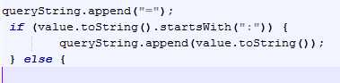 When Play framework had a problem with the URL parameter. When it parses the view, it translates it to an URL that will work as a GET reques t. If the parameter value starts with ":", some exception is launched and fails to escape the value: