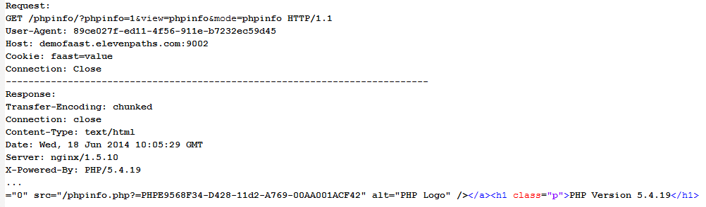Se puede ver una petición al servidor, una respuesta y parte del contenido que es la evidencia de que se está ante un PHP Info que provocará la fuga de información. Además, la herramienta se nutre de toda la información para seguir explorando las posibilidades que este tipo de fuga ha provocado.
