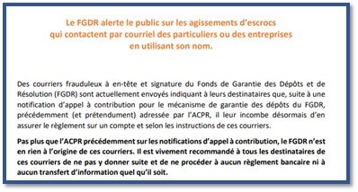 El Fondo de Garantía de Depósitos de Francia (FGDR) publicaba una alerta en la que advertía sobre estafas realizadas por agentes amenaza que utilizaban en membretes de correos electrónicos y documentos, el nombre y logo de dicha institución con el fin de ganarse la confianza de sus víctimas, al dar a entender que hasta un depósito de 100.000€ estaría garantizado por el estado francés en caso de perdida.