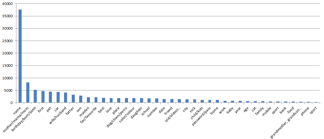 Con esta muestra, más allá de la anécdota, en realidad se pretende dar una idea de los elementos entorno a los que construimos nuestras contraseñas o las salvaguardamos. Parece claro que asociamos habitualmente la custodia de unos datos valiosos (una cuenta de un banco) a nuestros seres o recuerdos queridos. A ellos se dedican buena parte de las veces las contraseñas pero más aún estas preguntas cognitivas que sirven de pista. La razón es sencilla: son datos que no son muy cercanos y por tanto no vamos a olvidar. ¿Qué mejor fórmula para definir algo que se nos ha dicho que sirve como recordatorio?