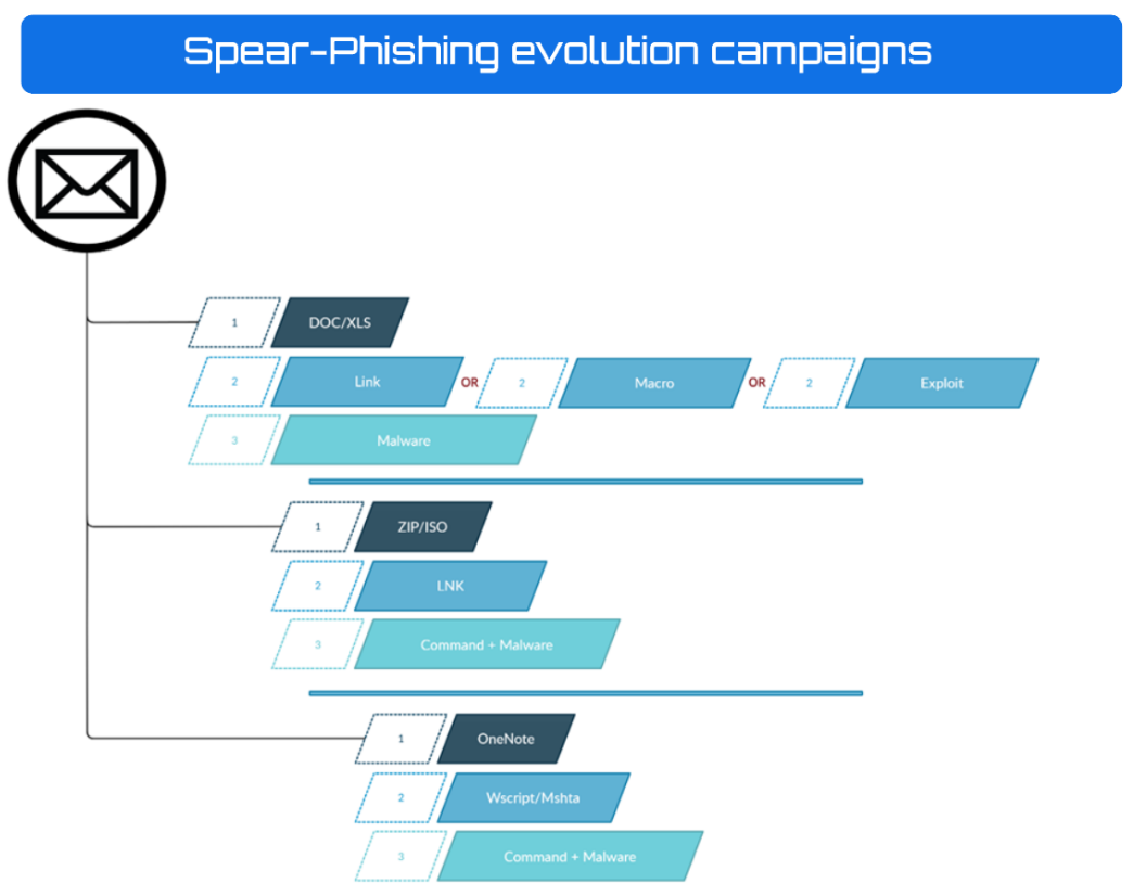 La evolución de técnicas como el Spear-Phishing se han visto marcadas por el uso que le han dado los grupos que las han usado, un esquema representativo de cómo han ido mejorando el método de actuación.