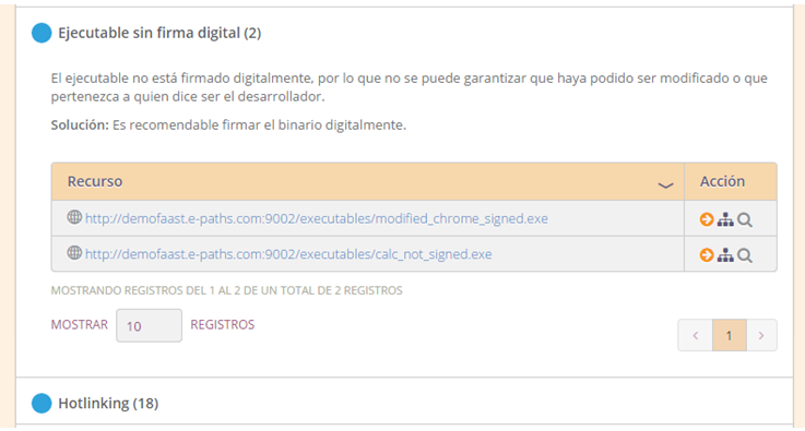 Aprovechando la estructura modular, en Faast no nos hemos limitado a los módulos que analizan las peticiones HTML, sino que también se evalúan los archivos binarios. En el caso de ficheros ejecutables se valora si están o no firmados digitalmente.